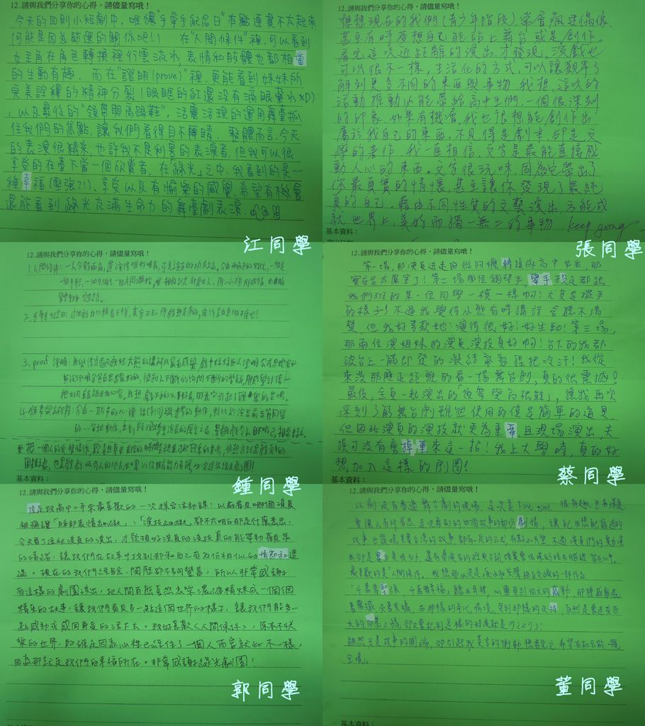 ☆很棒的表演!!雖然只是片段但十分精采。不同的故事有不同的啟發。兩個小時在老師的引導及歡笑中過去了,事後的省思或許才是更重要的,藉由演出看著一件件人生中會出現的阻礙與困難,不一定要親自發生,卻也讓我能思考自己的處理方式及以什麼樣的態度面對、解決它。四段表演都讓我印象深刻!我也重新的對自己某些觀點有不一樣的想法,我想這才是最重要的! --邱同學